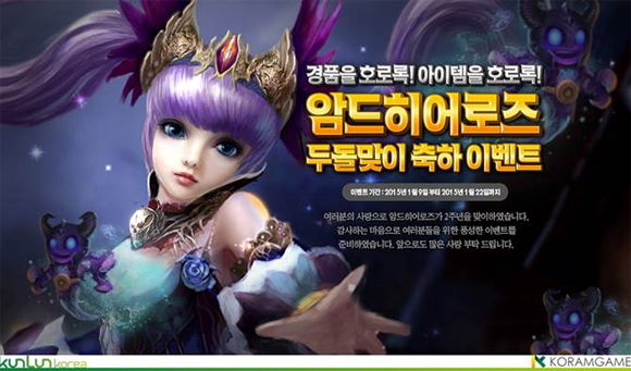 ... 먼저 암드히어로즈 출시 2주년을 축하하는 메시지를 작성하는 이벤트를 실시, 참여한 모든 게이머들에게 2주년 호칭, 성결한날개 등 게임 아이템을 획득할 수 있는 코드를 지급한다. 또한 추첨을 통해 2주년 기념 특별 한정 텀블러, 파리바게트 상품권 등을 추가로 증정한다.