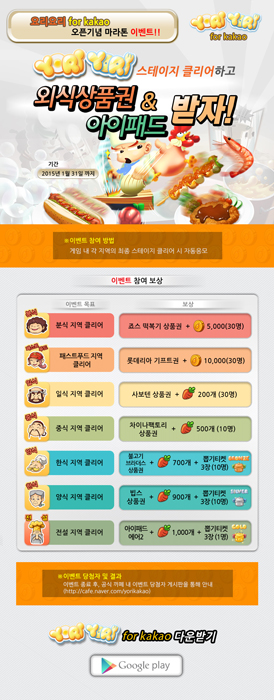 ... 요리요리는 현재 대형 프렌차이즈 20여곳과 협력 마케팅을 협의 중이며 제휴를 통해 게임 스테이지를 완료하면 유저들에게 시식권을 제공하는 방식이다. 현재 진행하는 이벤트 중 ‘요리요리 스테이지 클리어하고 외식상품권&아이패드받자!’ 이벤트는 게임 내 각 지역의 최종 스테