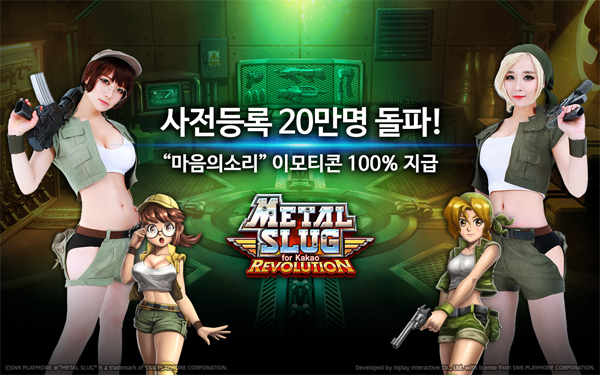 ... 아울러 정식 서비스 이후 게임을 내려 받기만 해도 네이버 인기 웹툰 작가 조석씨가 그린 ‘마음의 소리’ 카카오톡 이모티콘도 지급할 에정이다. ‘메탈슬러그 레볼루션 for Kakao’는 오락실 액션 게임의 레전드로 군림하고 있는 메탈슬러그 시리즈를 이용한 최신 모바일 슈팅 R