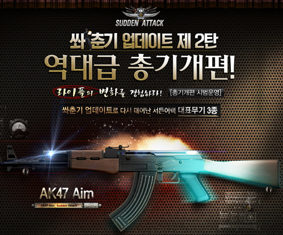 ... 신규 라이플 3종은 31일부터 내년 1월 15일까지 시범 서비스되며, 해당 기간 동안 전 이용자에게 3종을 모두 지급하여 자유롭게 이용해 볼 수 있도록 한다. 같은 기간 신규 무기 3종을 사용해 각각 10회의 킬 기록을 달성하는 유저에게는 'Aim' 칭호를 지급하는 이벤트도