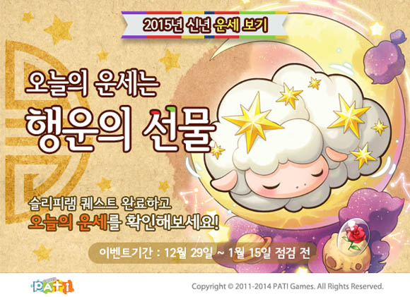 ... 숲속의앨리스 for Kakao는 신규 컨텐츠 업데이트와 함께, 이용자들을 위한 색다른 이벤트를 준비하고 푸짐한 선물을 증정한다. 먼저 2015년 1월 15일까지 2015 오늘의 운세 이벤트를 열고 게임 내에서 슬리피램 퀘스트를 완료 후 이벤트 맵 굿모닝빌 햇빛계단을 매일 1