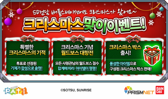 ... 이어 크리스마스 기념 두 번째 월드보스 대항전이 2015년 1월 2일까지 개최된다. 월드보스 기체인 유니콘 2호기 밴시 NT-D를 참여자들이 함께 공격한 후, 월드보스에게 입한 총 데미지가 일정 점수 이상을 달성한 참여자 중 상위 순위 100명에게는 인기 투표 2위로 선정된