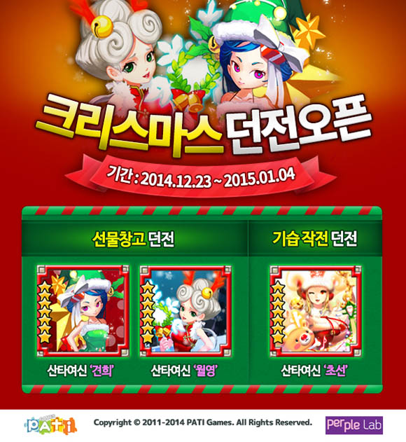 ... 또한 크리스마스 당일인 12월 25일에는 하루 동안 영웅 합성 시 성공 확률이 1. 5배 증가되며 모든 던전의 활동력이 절반으로 줄어드는 등 특별 이벤트가 진행될 예정이다. 뿐만 아니라 각종 구매 이벤트도 함께 실시한다