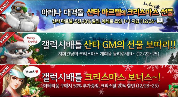... 또한 23일부터 25일까지는 게임 캐쉬인 마테리움 구매시 50%를 추가로 증정하고, 크리스탈을 20% 할인 판매하는 행사도 함께 진행한다. 대반전 브레인어택 게임 '아레나대격돌'은 24일부터 28일까지 챔피언 마르텔의 산타 복장 스킨을 70% 할인 판매하는 산타 마르텔의 크
