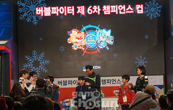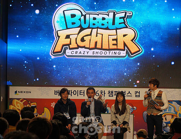 ... 20일 넥슨은 자사가 서비스하고 로두마니스튜디오에서 개발한 3인칭 슈팅게임 '크레이지슈팅 버블파이터'의 6차 챔피언스컵을 서울 삼성동 곰TV스튜디오에서 개최했다. 이날 행사는 일반부와 가족부로 나눠 진행되고 문새벽 버블파이터 총괄 디렉터가 참석해 겨울 업데이트(23일 적