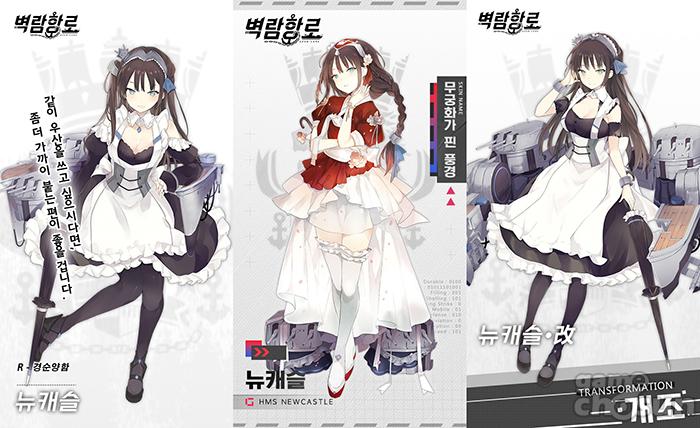 ...뉴캐슬은 ‘벽람랑로’ 게임 내에서는 과거 로열 네이비의 메이드대 총괄을 맡았던 선배 메이드라는 설정으로 참전하게 되며, 실제 역사 설정 상 과거 한국전쟁이 참전한 경험이 있는 영향으로 특별히 한복 스킨이 추가 됐다. ‘벽람항로’ 측은 많은 유저들의 피드백을 반영하여 이번에 사쿠라
