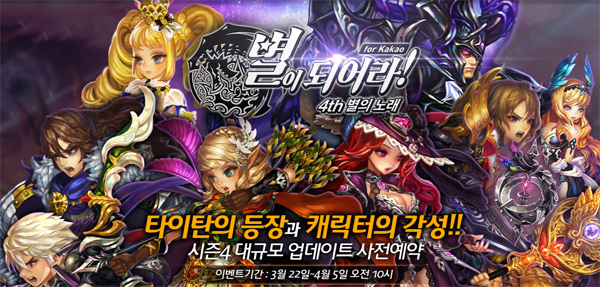 ... 이벤트에 참여한 모든 유저들에게 ‘영웅 선택권’이 제공되며 ‘친구와 사전 예약하기’ 이벤트를 열어 친구 초대 수에 따라 ‘영웅선택권’과 ‘직업확정권’ 등이 주어진다. 또 시즌4 각성 캐릭터에 기대평을 남기면 추첨을 통해 200루비(게임재화)도 지급될 예정이다. 한편 별이되어