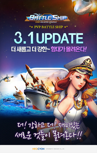 ... 먼저, 저승의 현무, 청용의 분노, 백호의 위엄, 불타는 주작과 같은 기존 함대보다 더 리얼하고 강한 신규 함대가 추가 됐으며, 캐릭터 레벨과 건축물 등 최대 레벨이 80까지 상향 조정됐다. 또한, 새로운 스테이지나 ‘제조공장’, ‘상점’에서 부품을 획득할 수 있는 기회가