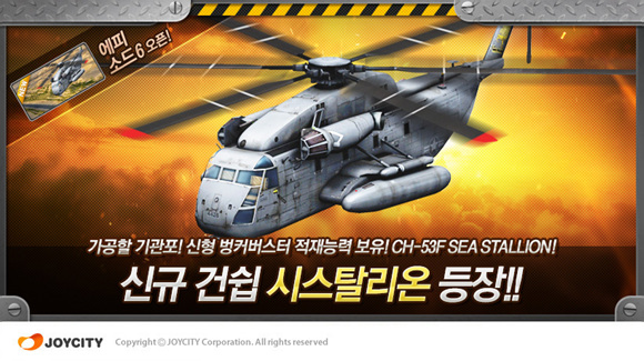 ... 조이시티는 이를 기념해 오는 21일까지 신규 건쉽 ‘CH-53F 시스탈리온’를 비롯한 모든 기체를 구매하는 유저에게 구매 가격의 30%에 해당하는 골드 혹은 달러를 돌려주는 페이백 이벤트를 실시한다. 또한 페이스북을 통해 2014년도 최고 인기를 얻은 건쉽을 가리는 ‘제 1회