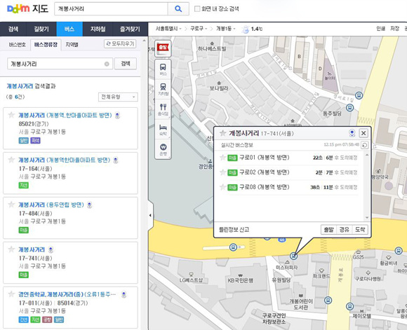 ... 다음카카오는 이에 더해 한국스마트카드와 업무 제휴를 맺고, 서울 지역을 우선으로 다음 지도의 실시간 정보 영역을 마을버스까지 확대했다. 서울시내 230여 노선의 마을버스들이 지금 어느 곳을 지나고 있는지 또는 언제쯤 인근 정류장에 도착할지, 다음 지도를 이용하면 알 수 있다.