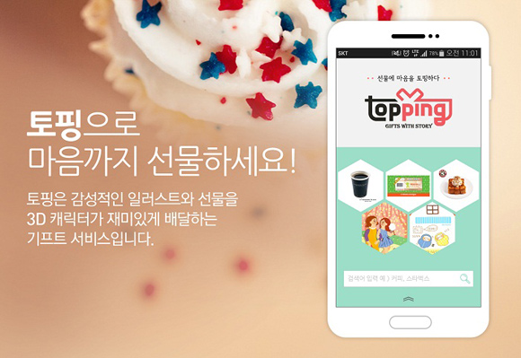 ... 3D 배달부 기능이란 선물 받는 사람의 휴대폰 배경화면에 3D 캐릭터가 선물을 배달해주는 서비스로, 토핑 앱을 설치한 이용자끼리 확인할 수 있다. 이강덕 한국선불카드 대표는 "토핑은 선물에 일러스트와 메시지를 더함으로써 선물하는 사람의 마음까지 전달할 수 있는 장점이 있다”며
