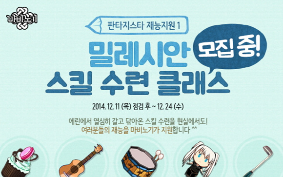 ... 신청자 중 서류심사 및 면접을 통해 30명의 유저를 선발하며, 최종 선발된 유저들은 총 3개월의 교육 과정을 수료한 후, 각 재능을 활용한 사회공헌 활동과 ‘마비노기 플리마켓’ 등의 행사에 참여하게 된다. 마비노기 ‘판타지스타 재능지원 프로젝트’에 대한 보다 자세한 내용은