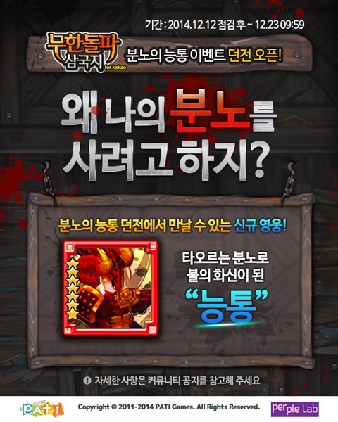 ... 1주년 기념 이벤트 중 마지막인 이번 이벤트는 오는 23일(화)까지 12일간 진행된다. 첫 번째로 이벤트 던전 분노의 능통이 전격 공개된다. 이 던전에는 전투 중 확보할 수 있는 붉은 소환부 아이템을 소모하여 입장할 수 있다