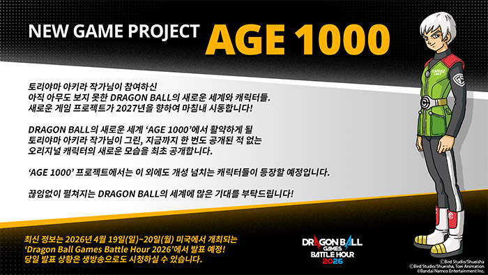 ... ‘AGE 1000’ 프로젝트에서는 이 외에도 개성 넘치는 캐릭터들이 등장할 예정이다. 끊임없이 펼쳐지는 드래곤 볼의 세계가 여러분을 기다린다. 이 프로젝트에 관한 다음 소식은 한국 시간 2026년 4월 19일(일)~20일(월) 미국 캘리포니아주