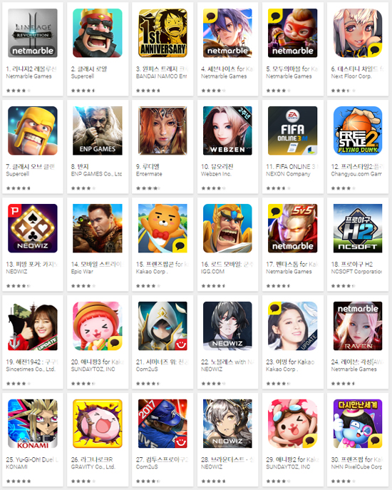 ... 특히 모두의마블은 매출 순위에서 오랜 기간 상위권을 유지하며 비(非) RPG 장르의 선두로 나선 상태다. 모두의마블 뒤를 이어 클래시오브클랜, 피파온라인3M, 프리스타일2:플라잉덩크, 피망포커, 모바일스트라이크 등 스포츠-전략 장르가 중상위권을 형성했다. 더불