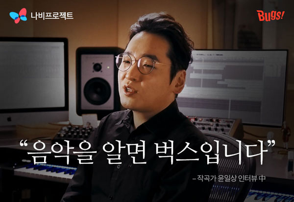 ... ‘윤일상편’은 ‘박재범편’, ‘개발자편’에 이은 ‘나비프로젝트’의 3차 광고 영상이다. 데뷔 26년차 작곡가 겸 프로듀서인 윤일상은 “트렌드를 쫓아가면 트렌드를 잡지 못한다”며, “벅스는 누구도 하지 않았던 서비스를 내놓기 때문에, 벅스 서비스를 이용한다는 것은 그