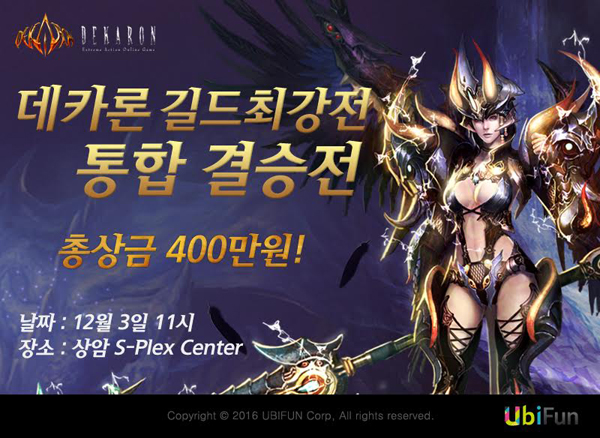 ...데카론의 길드 최강전은 총 상금 400만 원과 날개, 무기 아이템 등 최강의 아이템이 걸려있으며, 올해로 12회차를 맞이하는 데카론의 전통적인 행사다. 4강에 오른 4개 길드 외에도 현재까지 약 200명 이상이 길드전 참관 신청을 했다. 유비펀에서는 길드 최강전에 참석하는 모든