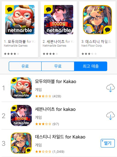 ... 11월부터 돌풍을 일으키며 약 한달여간 1위를 유지했던 '데스티니차일드'는 3위로 밀려나게 됐다. '모두의마블'은 전세계 도시를 사고파는 익숙한 방식의 모바일 보드게임으로, 두터운 팬층을 형성하며 장기간 국내 양대마켓 정상을 지켜왔던 작품이다. 또 이 게임은 전세계 2억 다운로