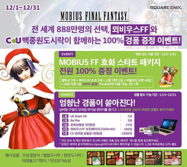 ... 당첨자 발표는 ‘MOBIUS FINAL FANTASY’ 공식 카페를 통해 진행된다. 연말을 기념하며 기존 유저를 비롯해 전 세계적으로 신규유저, 복귀유저를 환영하는 이벤트를 진행해 열띤 참여가 예상된다. 기존 유저에게는 어빌리티 티켓 20장을 100% 제공하며, 30일