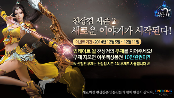 ... '하늘의 검을 다스리는 자', '강호의 역습' 등 게임에 어울리는 부제 사용으로 이목을 집중시킨 '천상검'은 시즌2를 앞두고 3번째 부제를 선정하기 위한 '부제 공모전'을 12월 5일(금)부터 11일(목)까지 공식 카페를 통해 진행한다. '천상검'의 '부제 공모전' 이벤트