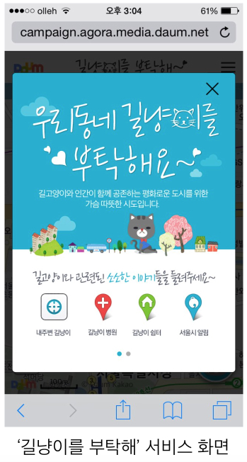 ... 국내 최초로 시도하는 길냥이를 부탁해 커뮤니티 서비스는 개발 단계부터 한국고양이보호협회 등 시민단체와 캣맘들의 의견을 적극 수렴해 반영했다. 지도 상에 동물 병원과 길냥이 쉼터 정보를 표시하고, 위험에 처한 길냥이를 발견했을 때 신고 기능 등, 길냥이 보호에 실질적인 도움을