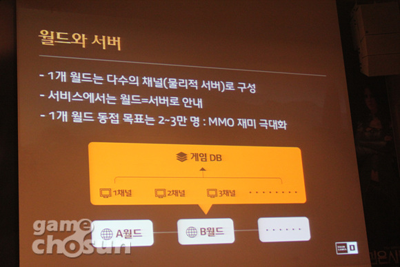 ... 이렇게 큰 월드를 만드는 이유에 대해 함영철 다음게임 팀장은 “MMORPG의 재미를 극대화하기 위해서이다”며 “공개시범테스트(OBT) 단계에서의 목표는 2~3만 명으로 정했다”고 밝혔다. 또한, 이는 거대 길드의 ‘압도적인 지배’를 방지하겠다는 노림 수도 있다. 고도성