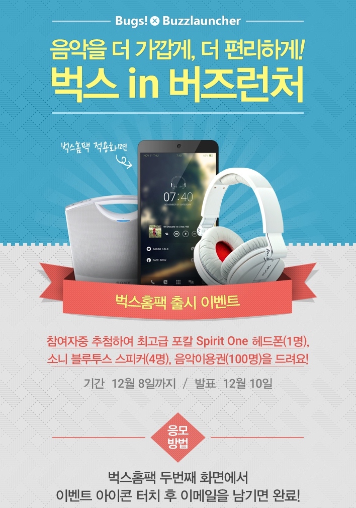 ... 음악포털 벅스는 다음카카오의 자회사 버즈피아와 함께 지난 달 25일 ‘벅스 버즈런처 음악 홈팩’을 출시한 바 있다. 안드로이드 스마트폰 첫 화면에서 바로 플레이어를 컨트롤 하며 음악을 감상할 수 있는 점이 특징이다. 또한 ‘이 달의 앨범’, ‘스타 플레이리스트’, ‘숨은 아