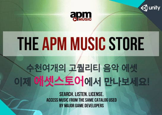 ... 특히 고퀄리티의 음악을 합리적인 가격에 구입해 개발 중인 게임에 적절하게 사용하는 것이 가능하며, 한번의 클릭으로 기존의 복잡했던 법적 라이선스까지 해결할 수 있도록 하였다. 또한 APM 검색엔진과 라이브러리가 에셋 스토어 내에 통합되어 유니티 개발자들이 보다 간편하게 사용할