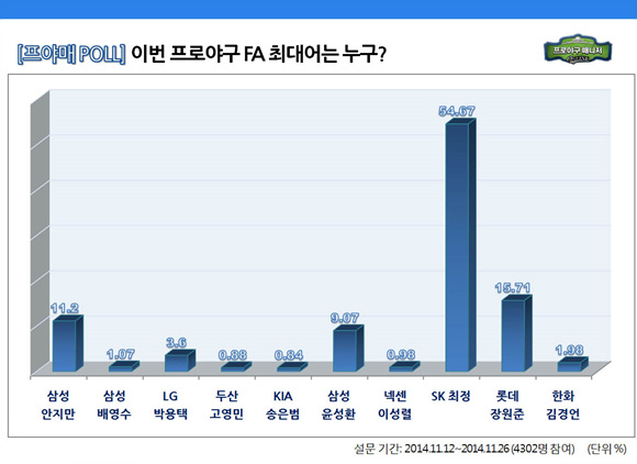 ... 최정은 올해까지 5년 연속 3할 타율 넘었고 지난해까지 4년 연속 모두 20홈런을 기록했으며, 수비 능력은 독보적인 3루수라 평가 받고 있다. 젊은 나이라는 이점까지 더해져 최정은 FA 사상 최초로 4년간 100억 원 계약이 가능한 유일무이한 존재로 부각되고 있다. 이 같은