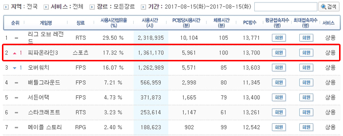 ...추측되는 원인은 피파온라인3의 광복절 이벤트 효과이다. 프리미엄 PC방에서 피파온라인3를 30분, 90분, 180분을 이용한 유저에 한해 인게임 아이템과 머니를 지급하는 버닝 이벤트가 영향을 끼쳤을 가능성이 농후하다. 한편, 비슷한 장르의 게임이자 카카오게임즈와 손잡은 '배틀그라