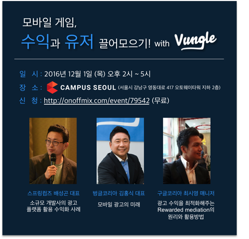 ...1 동영상 광고 플랫폼으로서의 입지를 굳혔다. 이번 ‘모바일 게임, 수익과 유저 끌어모으기!’ 세미나에서는 업계 전문가인 구글(Google) 애드몹의 최시영 매니저와 스프링컴즈의 배성곤 대표를 초빙하여 제목 그대로 게임사에 꼭 필요한 수익과 고퀄리티 진성 유저 확보 방안을 공개한다