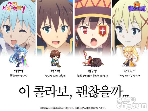 ...캐릭터는 아쿠아, 카즈마, 메구밍, 다크니스 4종으로 원작 주인공들의 외형과 스킬 사용 장면을 게임 캐릭터로 재현해냈다. 와이디온라인은 “애니메이션에서 볼 수 있었던 다양한 공격 스킬도 게임 속에 선보일 예정이니 ‘갓오브하이스쿨’에서 원작의 재미를 맛보시길 바란다”라고 전했다. 사