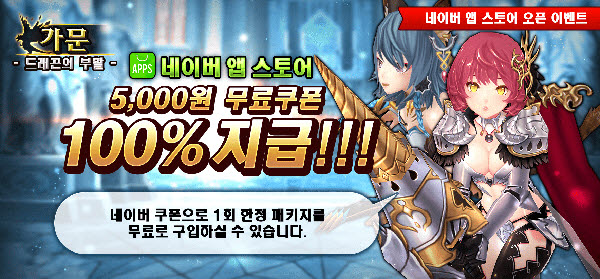 ... 가문:드래곤의부활은 사전등록자를 포함한 모든 사용자들에게 골고루 혜택을 제공하는 오픈 감사이벤트를 진행한다. 먼저 게임을 설치하는 모든 사용자들에게 5,000원 무료결제 쿠폰을 100% 지급한다. 이 쿠폰은 게임을 설치하면 네이버 앱스토어내 본인 쿠폰함 내에서 확인이 가능하
