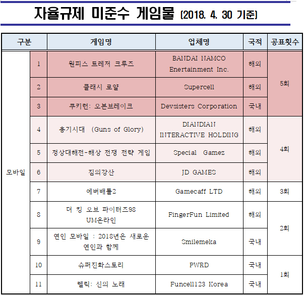 ...그 밖에 PWRD ‘슈퍼진화스토리’, 펀셀123코리아 ‘렐릭: 신의노래’ 총 2종 게임물이 신규 미준수 게임물로 확인되어, 2018년 4월 말 기준 자율규제 미준수 게임물은 총 11종이다. [조상현 기자 neulpeum@chosun. com] [gamechosun