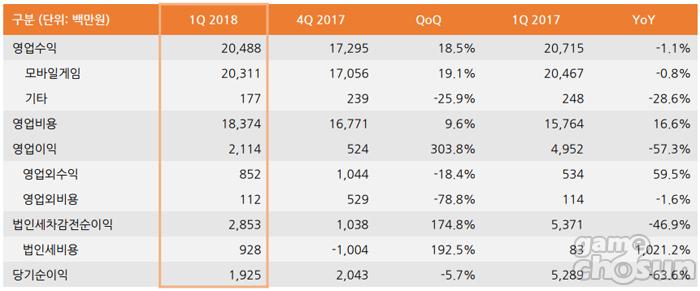...또한 매출, 영업이익, 당기순이익이 전년 동기 대비 각각 -1%, -57%, -64% 감소한 배경에 대해 회사측은 신작 출시에 따른 마케팅과 개발 인력 확대 등 중장기 투자 비용이 반영된 것으로 설명했다. 선데이토즈 2018년 1분기 실적 요약 = 선데이토즈 IR 자료실민광식 선데