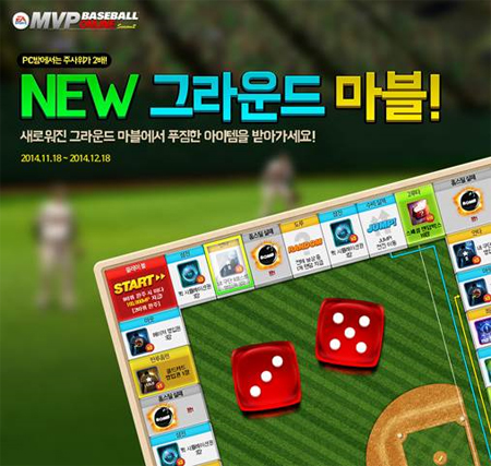 ... 단, 이벤트에 참여할 수 있는 주사위는 게임 접속 및 플레이를 통해 획득할 수 있다. 엔트리브소프트는 ‘그라운드 마블’을 완주할 때마다 10만 게임머니를 지급하고, 6번 완주하면 ‘투수/타자의 골드카드 영입권’을, 12번 완주하면 '10코스트 골드카드 영입권'을 증정한다.