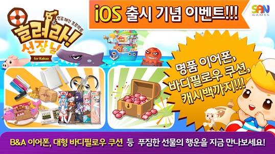 ... 올려라선장님은 iOS 버전 출시를 기념하여 다양한 이벤트를 12월 7일까지 진행한다. 플레이 결과에 따라 명품 이어폰, 대형 바디필로우 쿠션 등 푸짐하게 준비된 경품에 응모할 수 있으며 1만원 이상 결제하면 3000 루비를 캐시백처럼 돌려받을 수 있다. 또한 올려라선장