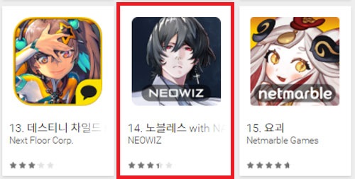 ... 원작의 스토리와 캐릭터를 구현했으며, 게이머가 직접 조작 가능한 4인 부대를 완성해 RPG장르의 재미를 추구하는 게임이다. ▲ 2017년 5월 8일 오후 국내 구글플레이 게임부문 최고매출 순위 갈무리 네오위즈는 신작 노블레스의 고공비행에 더해 기존 네오위즈의 캐
