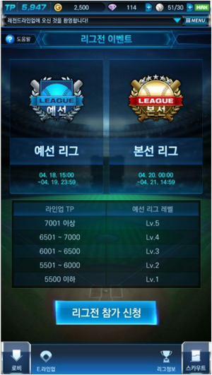 ... 예선과 본선 리그 모두 하루에 총 5경기를 진행할 수 있다. 게임 내 골드를 사용하면 동일 리그레벨 내에서 다른 상대를 선택할 수도 있다. 경쟁 콘텐츠인 만큼 리그 경기에서 승리하면 포인트를 획득하고, 패배 시에는 포인트를 잃게 된다