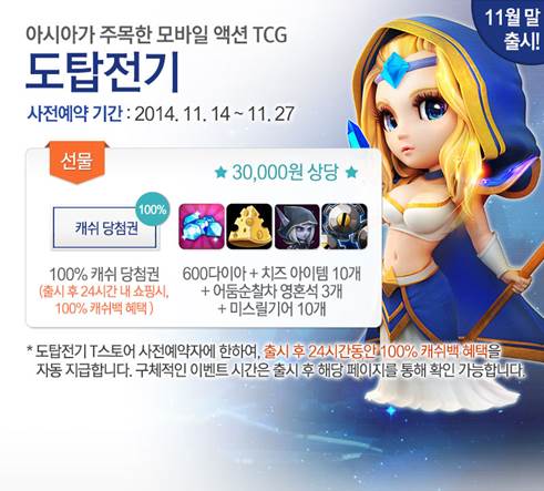 ... 특히 지켜보기만 하는 유사 장르 게임들과는 다르게 간편하고 쉬운 조작법을 채택하여 강력하지만 부담 없는 게임 플레이를 가능케 한다. T스토어에서는 정식 출시 전까지 사전 예약 이벤트를 진행하며 참가자 전원에게는 600다이아, 치즈 아이템 10개, 어둠순찰자 영혼석 3개, 미