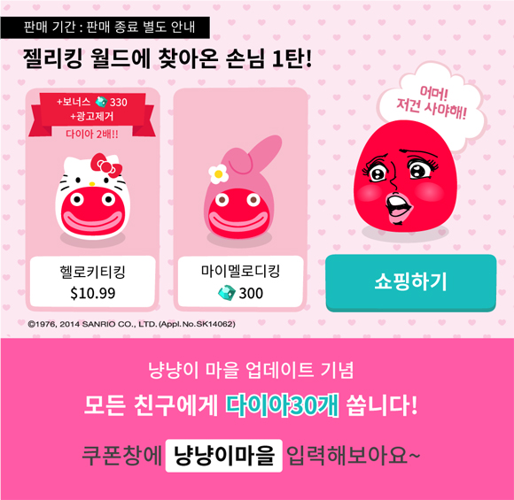 ... 이와 함께 스마트스터디는 헬로키티와의 콜라보레이션을 기념해 오는 20일까지 일주일간 젤리킹을 접속하는 모든 유저에게 30개의 추가 다이아몬드를 증정한다. 참여방법은 젤리킹 실행 후 쿠폰 입력창을 통해 냥냥이 마을을 입력하면 된다. 김민석 스마트스터디 대표는“이번 젤리킹과