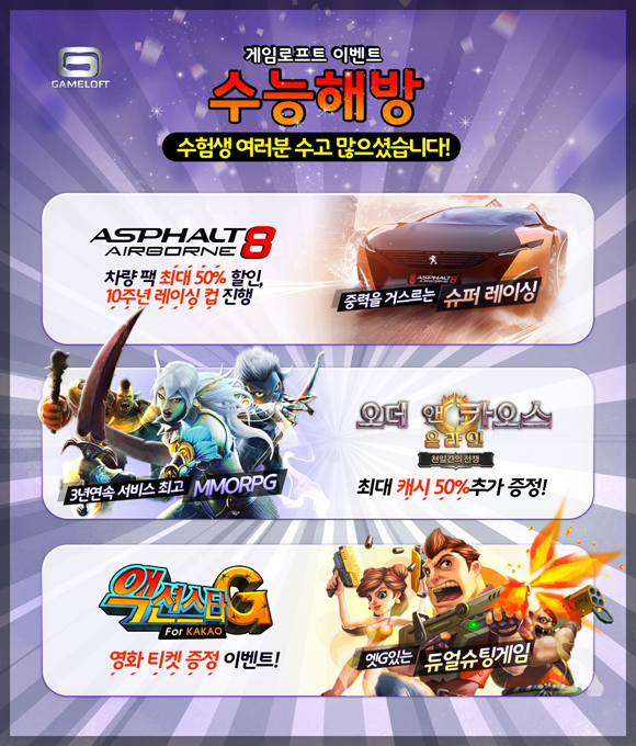 ... 정통 모바일 MMORPG 오더앤카오스온라인은 수험생들이 기대한 수능 점수보다 50%더 높은 점수를 받았으면 한다는 바람을 담아 50% 추가 캐시 증정 이벤트를 진행한다. 3주년 기념 무료화 전환 이후 더 높은 호응을 얻고 있는 오더앤카오스는 할로윈데이 기념 21번째 업데이트를
