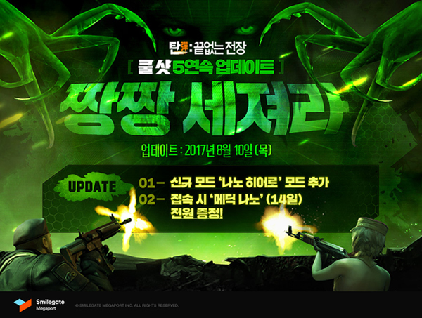 ... 용병 유저들은 나노를 퇴치하면 되고, 나노 유저는 제한 시간 내 용병을 모두 감염시키는 술래잡기와 같다. 이번 업데이트를 위해 나노 특화 무기와 나노 캐릭터들이 추가됐다. 나노 특화 무기는 샷건으로 '잭 해머-나노 킬러'다