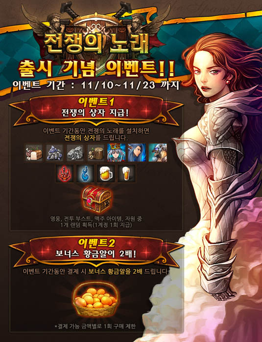 ... 공개서비스를 기념해 12월 4일까지 푸짐한 경품 증정 이벤트도 진행한다. 게임을 플레이하고 제공받은 포인트로 경품에 응모하면 아이패드 에어, 외식상품권, 백화점 상품권 등을 추첨을 통해 받을 수 있으며, 100% 직접 교환을 통해 그래픽카드(GTX 750), 27인치 모니터,