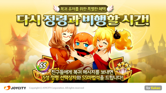 ... 총 10명의 휴면 유저를 초대하면 ‘정령 소환 티켓’ 5장을, 초대 인원이 10명씩 늘어날 때마다 각각 ‘마법석 소환 티켓’ 5장, ‘SS 마법석 선택권’ 1장, ‘5성 정령 선택권’ 1장을 추가 증정한다. 또, 복귀 유저를 대상으로는 출석 일수에 따라 약 2만원 상당의 리워드