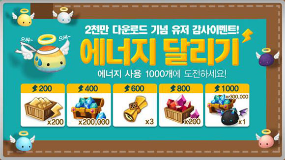 ... 최종적으로 1000개의 에너지를 사용하면 마나석 30만 개와 데빌몬을 증정한다. 보상 아이템은 에너지량을 달성한 후 게임 내 이벤트 페이지에 접속해 선물 받기를 클릭하면 우편함으로 지급된다. 이와 함께 오는 7일 정오부터 9일 자정까지 어둠속성의 4성 몬스터 팬텀시프를 획득