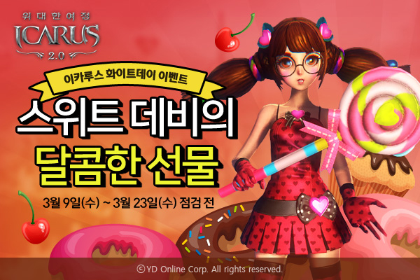 ... 다섯 가지 맛 사탕을 모두 획득하면 캐릭터 경험치 및 공격력, 방어력 등이 상승하는 무지개색 사탕과 교환할 수 있다. 또 매일 게임에 접속하는 유저에게 이벤트 기념 특별 신규 펫 ‘메이드 데비’ 와 펠로우 ‘큐티 포요’를 얻을 수 있는 ‘맛있는 사탕 주머니’와 ‘데비의 사탕
