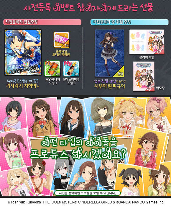 ... 이 게임은 일본에 출시돼 현재 등록 유저수 400만 명을 돌파하는 등 지속적인 인기를 이어가고 있다. DeNA 서울은 이번 아이돌마스터 신데렐라걸즈의 사전등록을 기념하여 금일부터 다채로운 이벤트를 진행한다. 아이돌마스터 신데렐라걸즈를 사전등록 하는 유저 전원은 아이돌 S레어