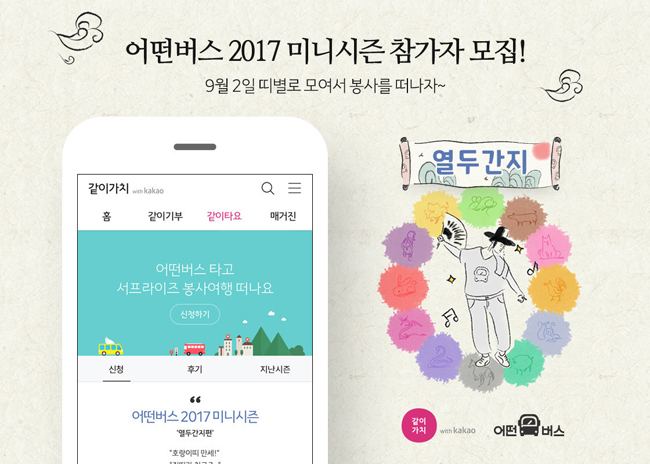 ... 20세 이상 성인이면 누구나 참가 신청을 할 수 있다. 특히 이번 시즌에는 ‘띠’별로 모여 버스를 타고 봉사활동을 떠나게 되어, 서로 다른 세대가 봉사를 통해 소통하고 친구가 될 수 있다. ‘어떤버스 2017 미니시즌-열두간지편’은 같이가치 with kakao 페이지에서 오는