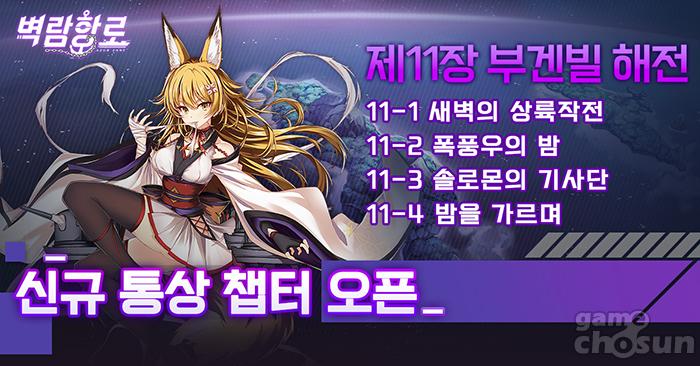 ...먼저 이번 업데이트를 통해 통상 스테이지 제11장과 어려움 스테이지 제7장이 개방되었다. 제11장은 높은 난이도로 널리 알려진 제10장 해역보다 더 어려워진 난이도와, 제11장에서 드랍으로만 획득할 수 있는 신규 함선 센다이, 컬럼비아, 아가노가 등장한다. 또 새로운 시스템으로